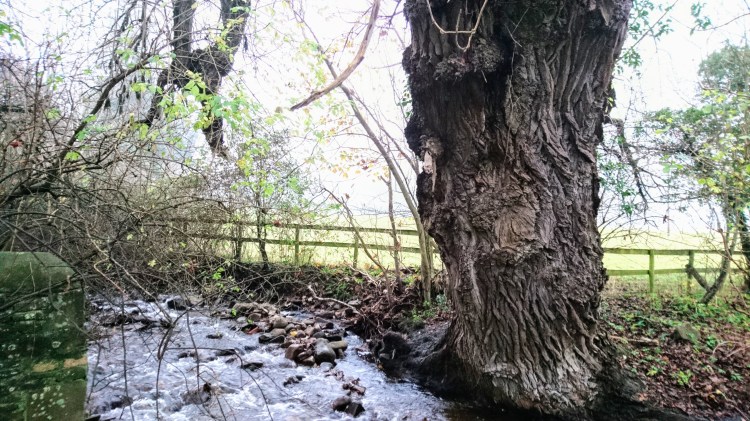 The brook, the Nant Onnau, flowing mistily past St Catwg’s church, Llangattock, on its way to the river Usk at Crickhowell Bridge …