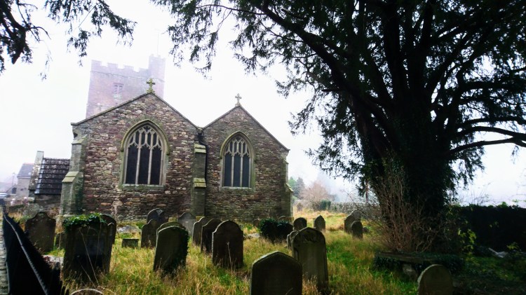 Yew and churchyard gravestones, with tower of St Catwg’s church, Llangattock fading into the mist