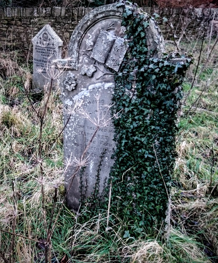 Ivy-covered 19th-century gravestone, St Catwg’s churchyard, Llangattock, Crickhowell, Powys