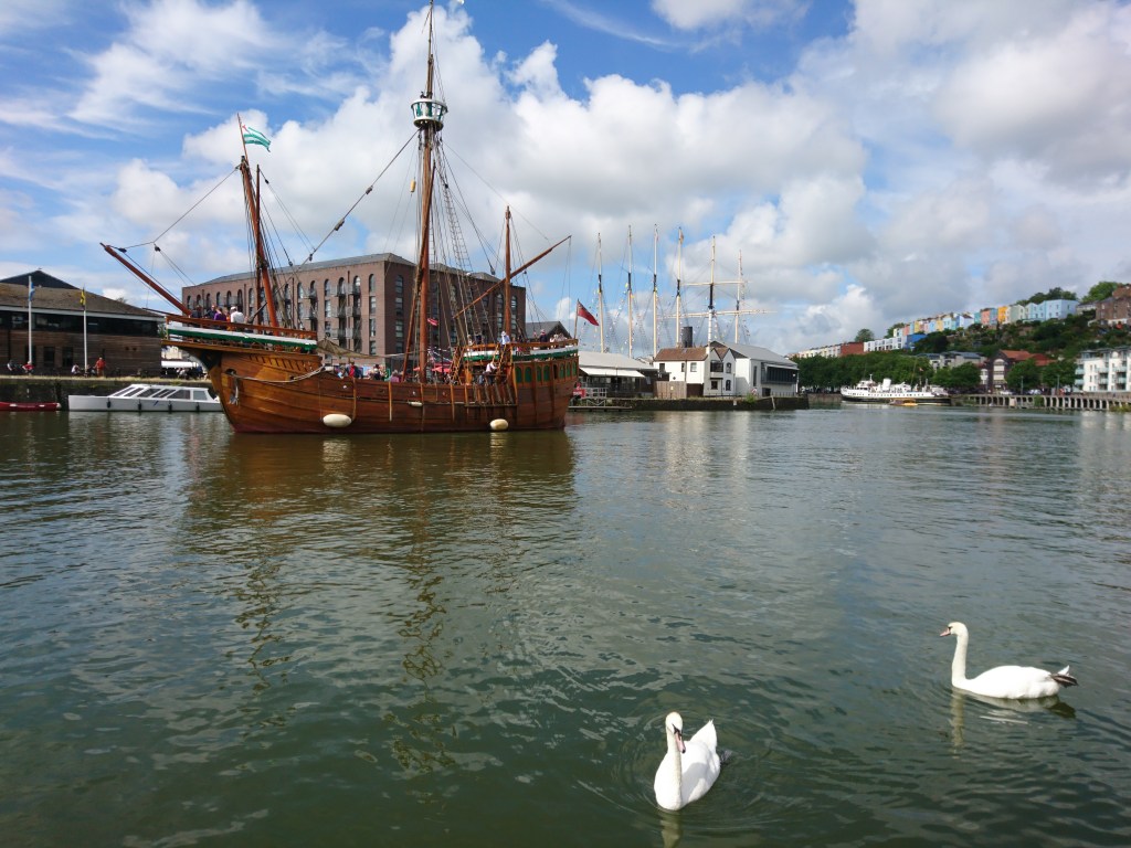 Replica of the Matthew, the ship in which the Genoese explorer Giovanni Caboto or John Cabot set foot in Newfoundland in 1497, running trips in Bristol’s Floating Harbour. Behind are the masts of the SS Great Britain, the restored transatlantic steamship; in the foreground (fore-water?) a pair of swans for scale
