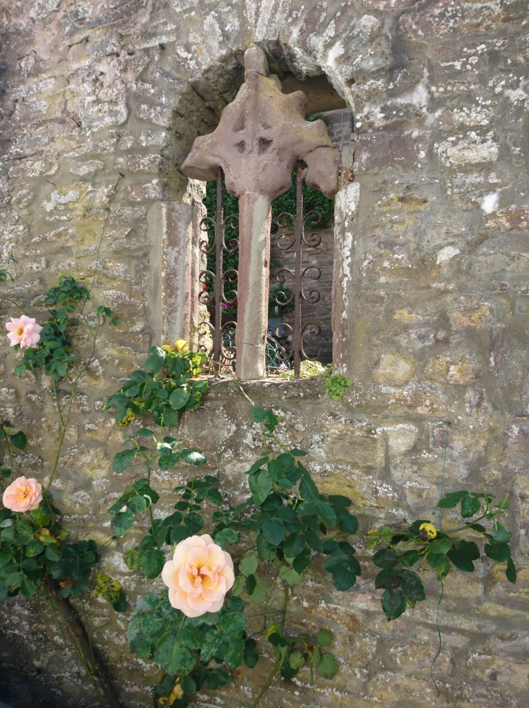 Roses and folly (with medieval castle window tracery), Tower Lane, Crickhowell, Powys.