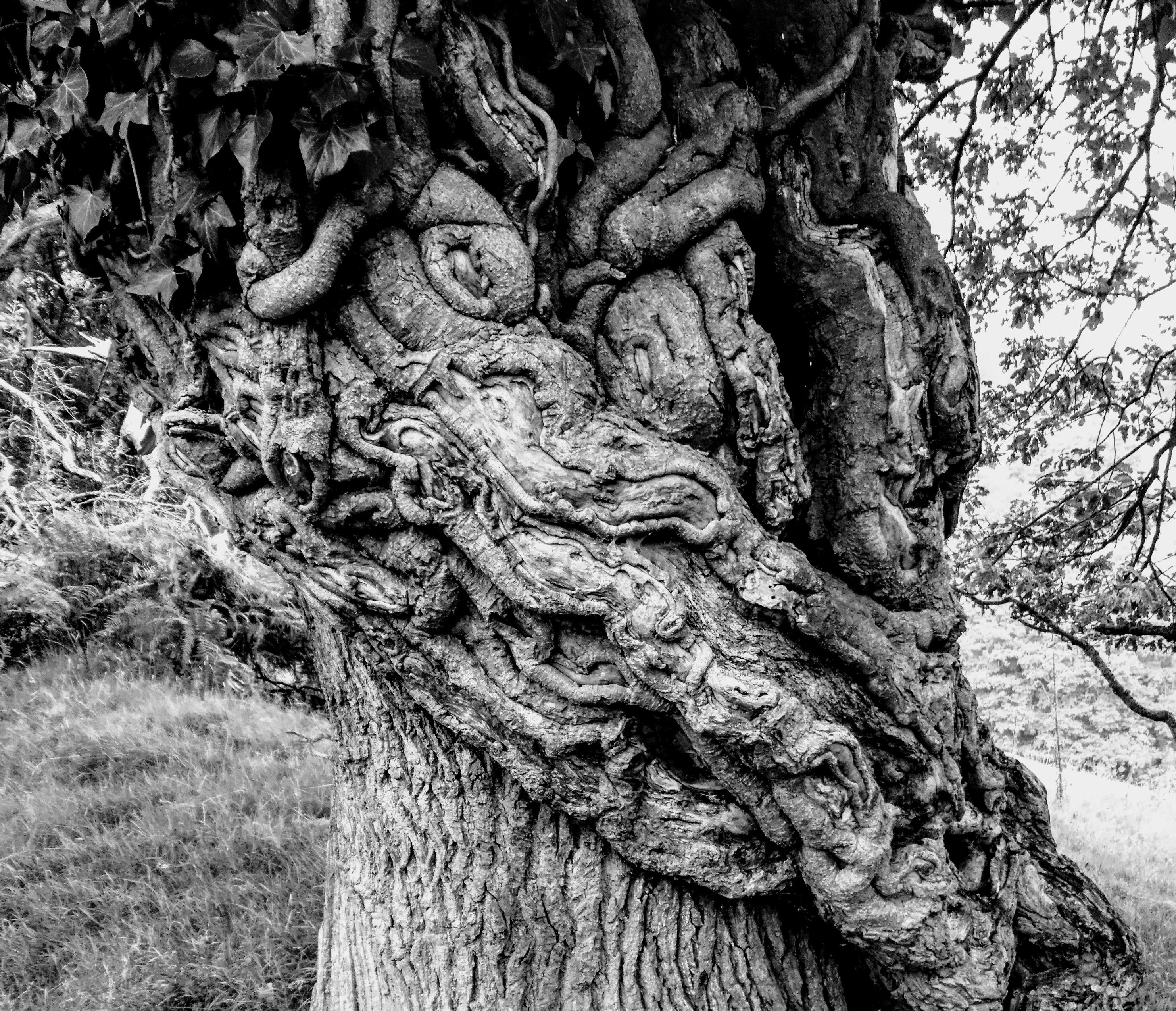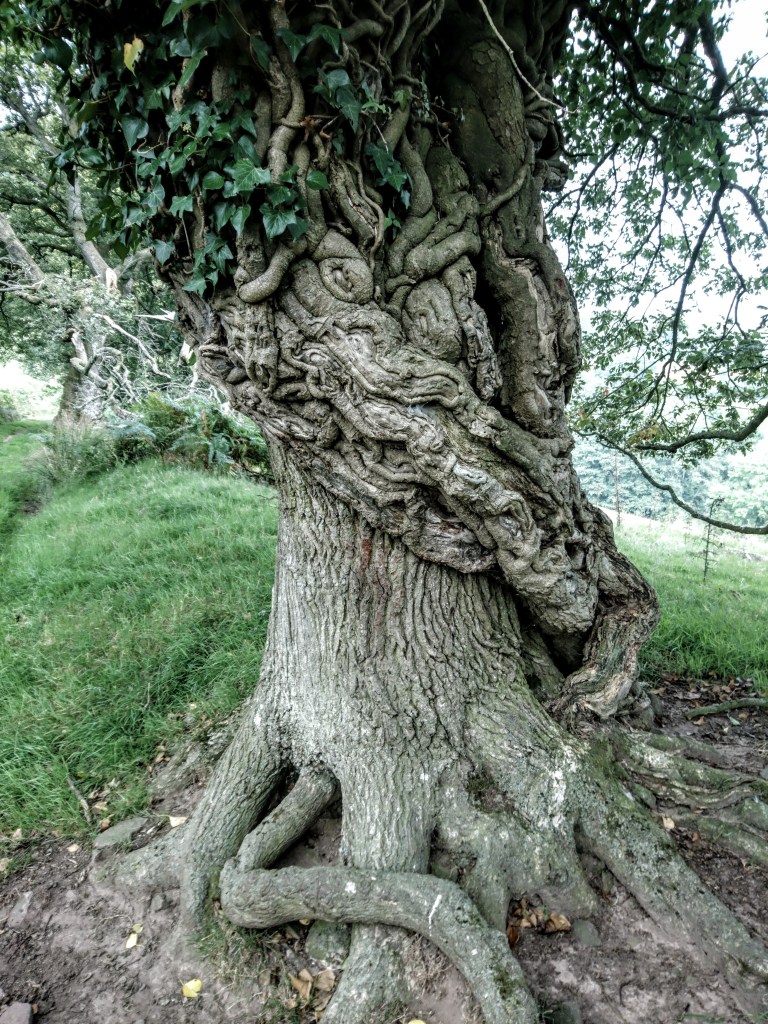 Ancient ivy hugging treetrunk, Sugarloaf Mountain, Brecon Beacons National Park. Look closer…