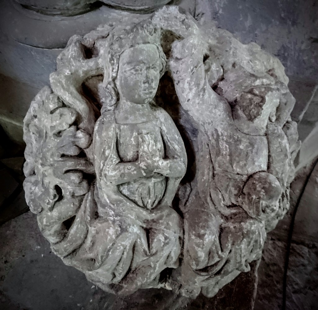 Medieval roof boss showing the Coronation of the Virgin, Dore Abbey, Abbey Dore, Hertfordshire