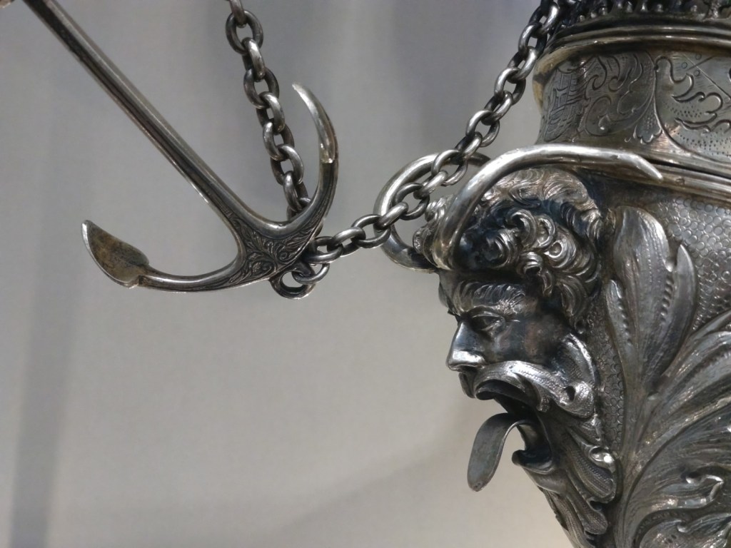 Satyr exhibitionist figurehead and anchor, silver sailing ship, Glynn Vivian gallery, Swansea