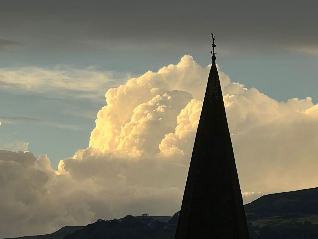 Cumulus cloud over the Black Mountains and behind the spire of St Edmund’s, Crickhowell