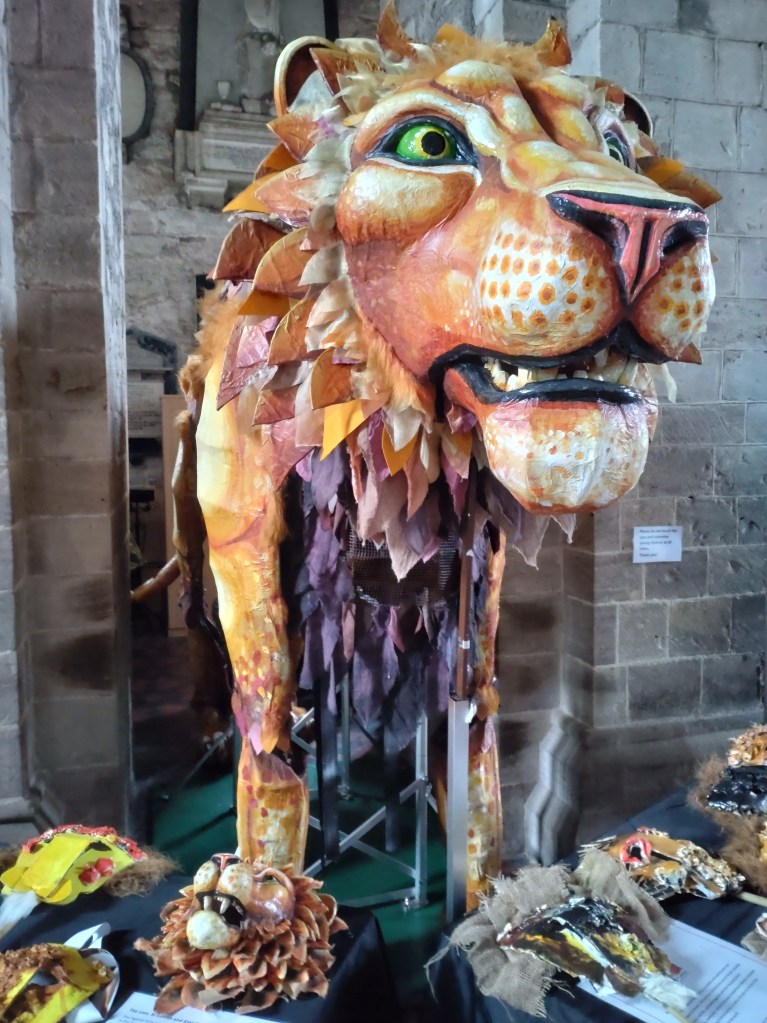 Model lion on display in Leominster Priory, Herefordshire. Designed and created by Leominster-based Fetch Theatre Company, it featured in Leominster (pronounced “Lemster”) Festival 2022 and was named Kyiv.