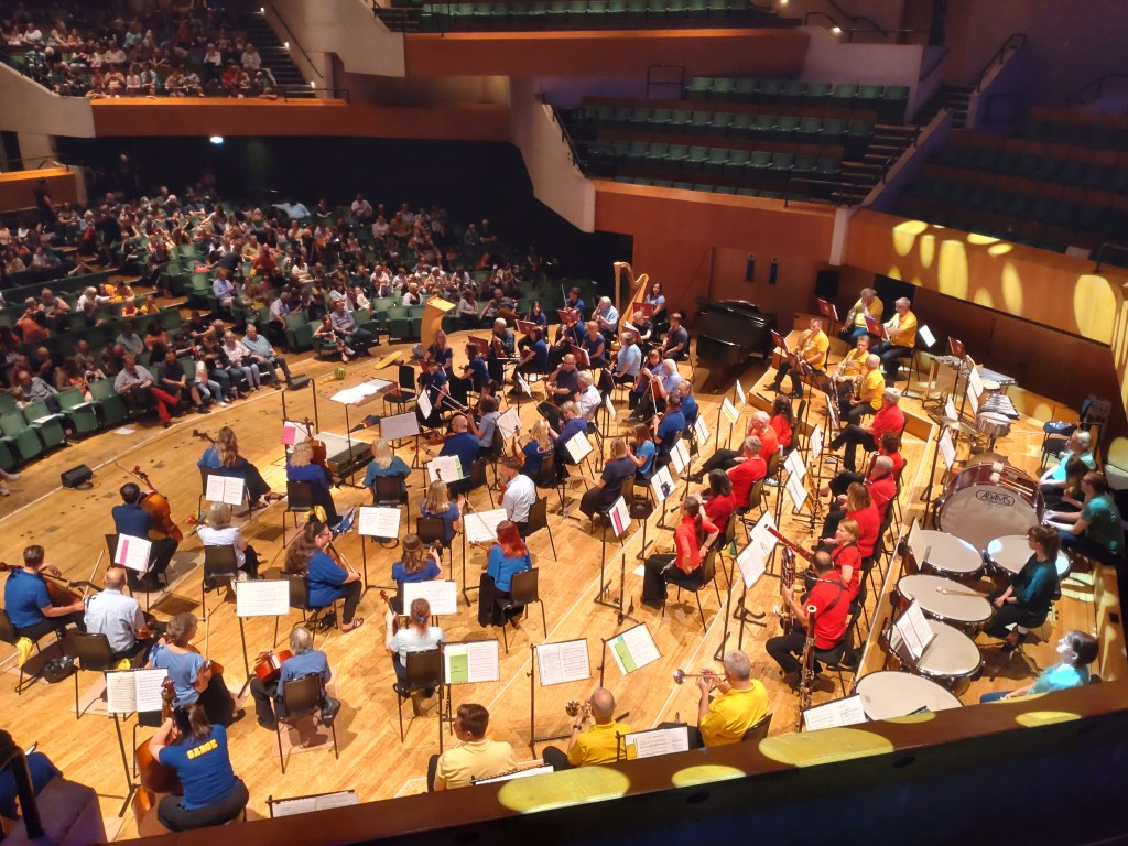 Before the concert begins: seen from the organ, Cardiff Philharmonic Orchestra ready for a Family Prom in Cardiff’s summer season