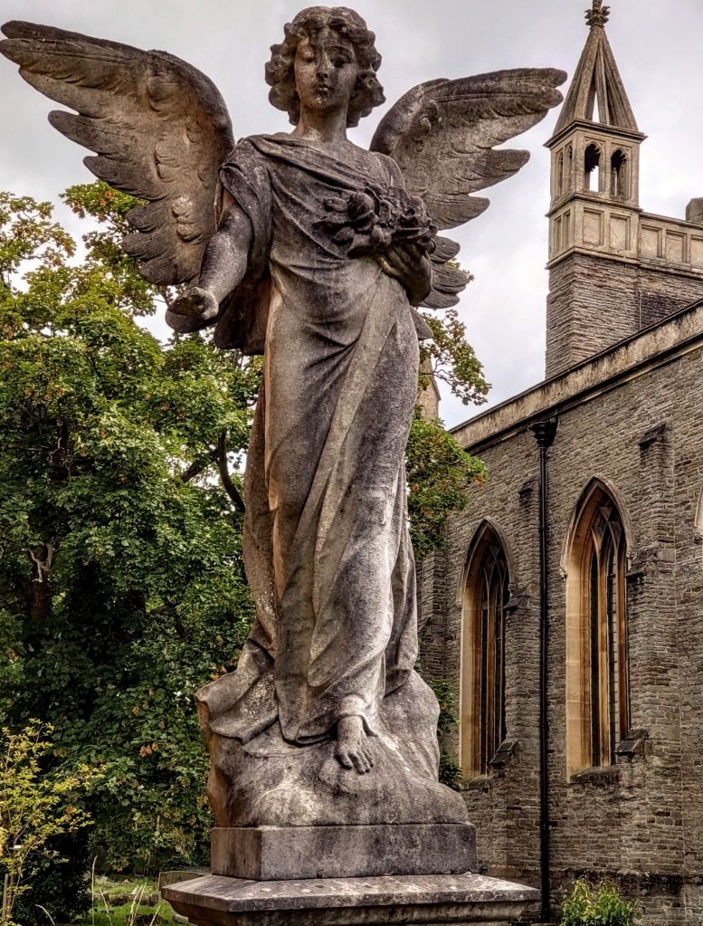 A final view of the bouquet-bearing angel sculpture against the backdrop of Christchurch, Downend. Built in 1831 as a Chapel of Ease to the church at Mangotsfield, East Bristol, it became a Parish Church in 1874.