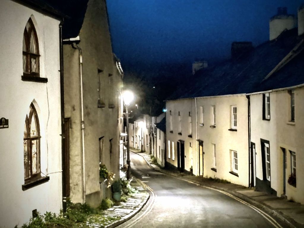 Dusk falls and street lamps light up on Bridge Street leading down to Crickhowell Bridge.
