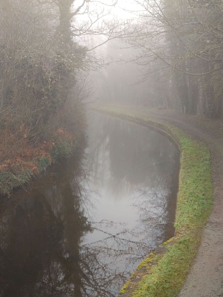 Misty canal curving out of sight, Dardy, Llangattock, Powys: Monmouthshire and Brecon canal.