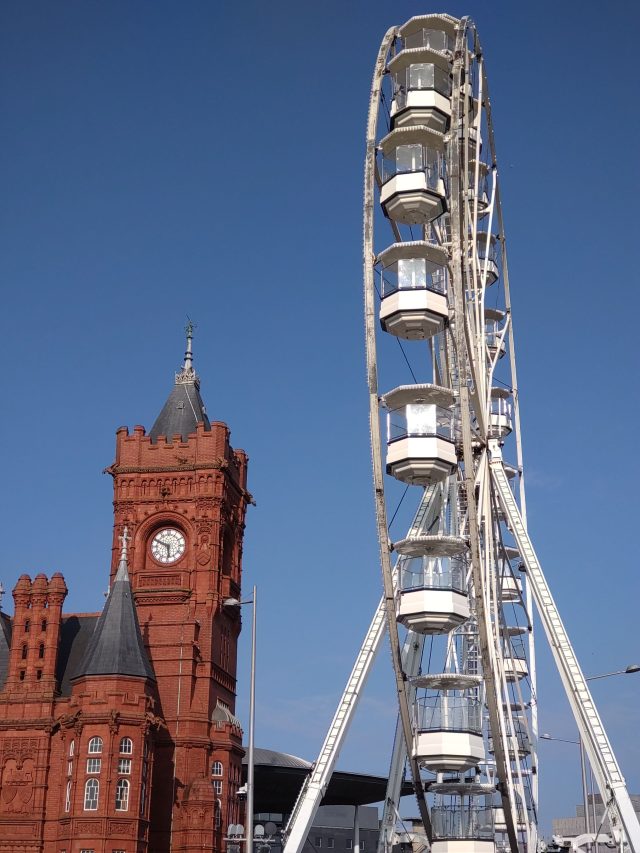 21st-century Ferris wheel and late 19th-century Adeilad y Pierhead (Pierhead Building), Cardiff.