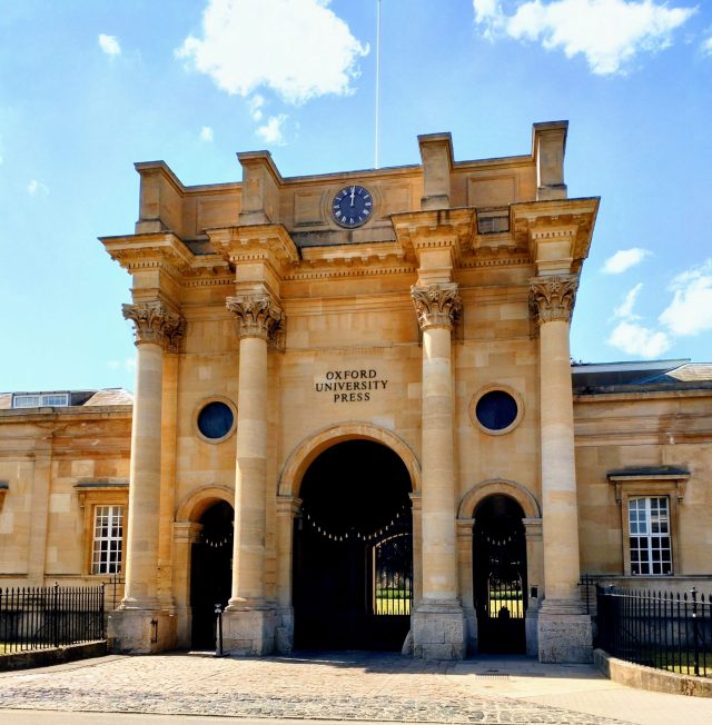 The imposing entrance at noon to the Oxford University Press site from Walton Street, Oxford: four Corinthian columns in Cotswold stone flank three archways.