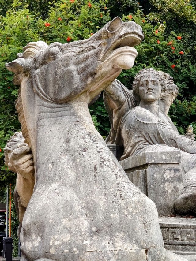 One of a pair of horses pulling the trireme of one of the tritons, Cardiff City Hall (1890, now the School of Social Sciences, Cardiff University), by Frederick William Pomeroy (1857-1924).