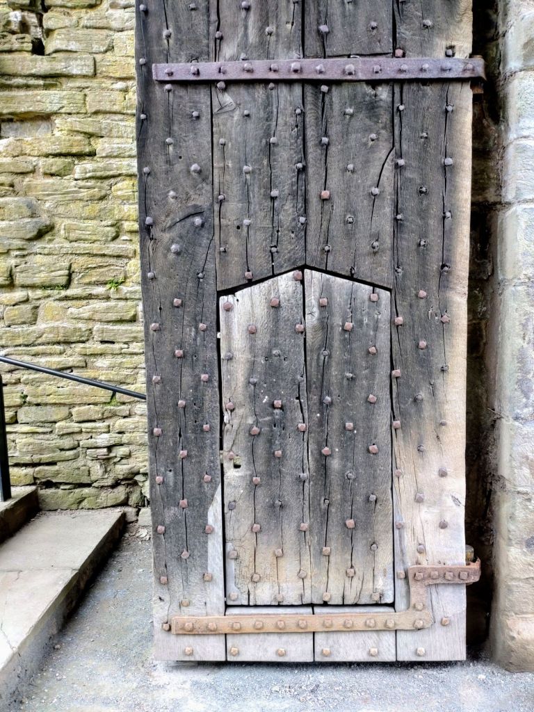 Latticework back of one of the restored 14th-century gateway doors, Hay-on-Wye Castle, Powys, Wales