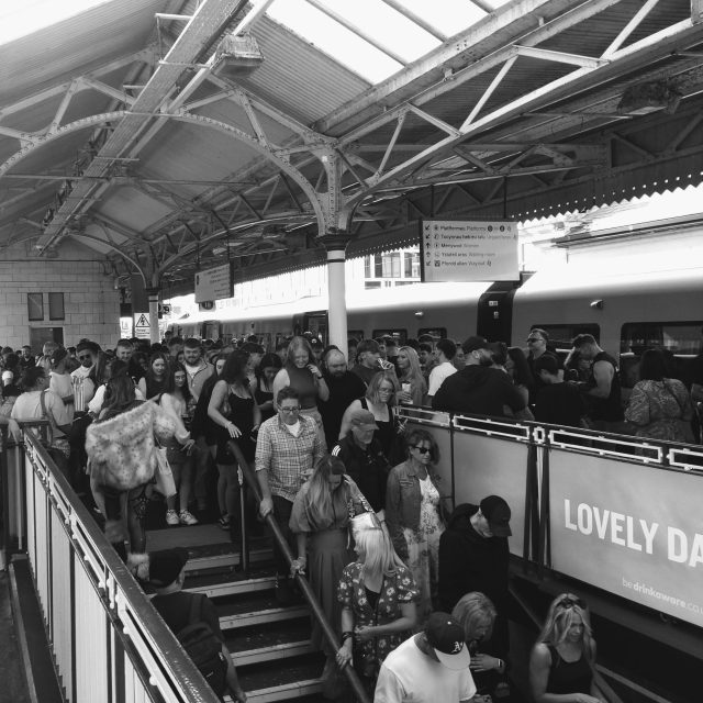 Having a “lovely day”: a crush of train passengers on a crowded platform, Cardiff Central railway station.