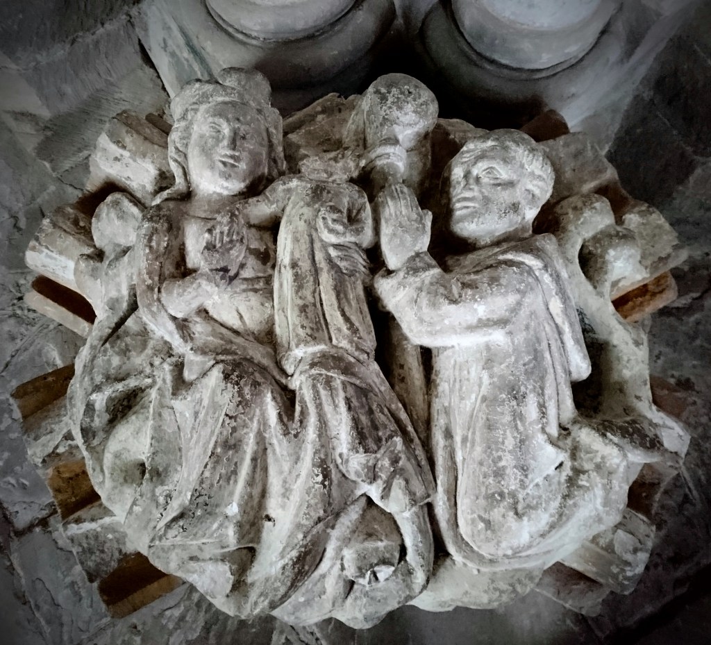 Medieval roof boss showing the Coronation of the Virgin, Dore Abbey, Abbey Dore, Hertfordshire