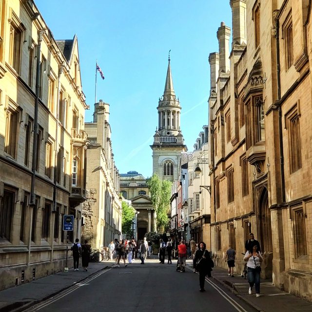 The colonnaded cornice of All Saints church spire and Lincoln College Library from Turl Street, Oxford.