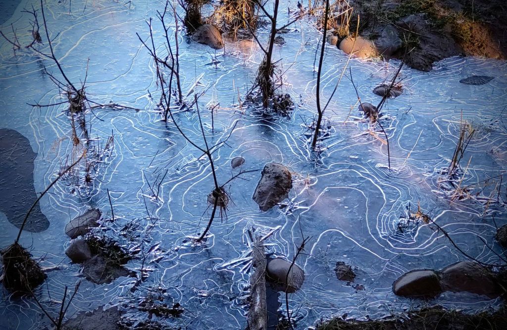 Iced-over pool, Glanusk Estate, seemingly etched with contour lines.