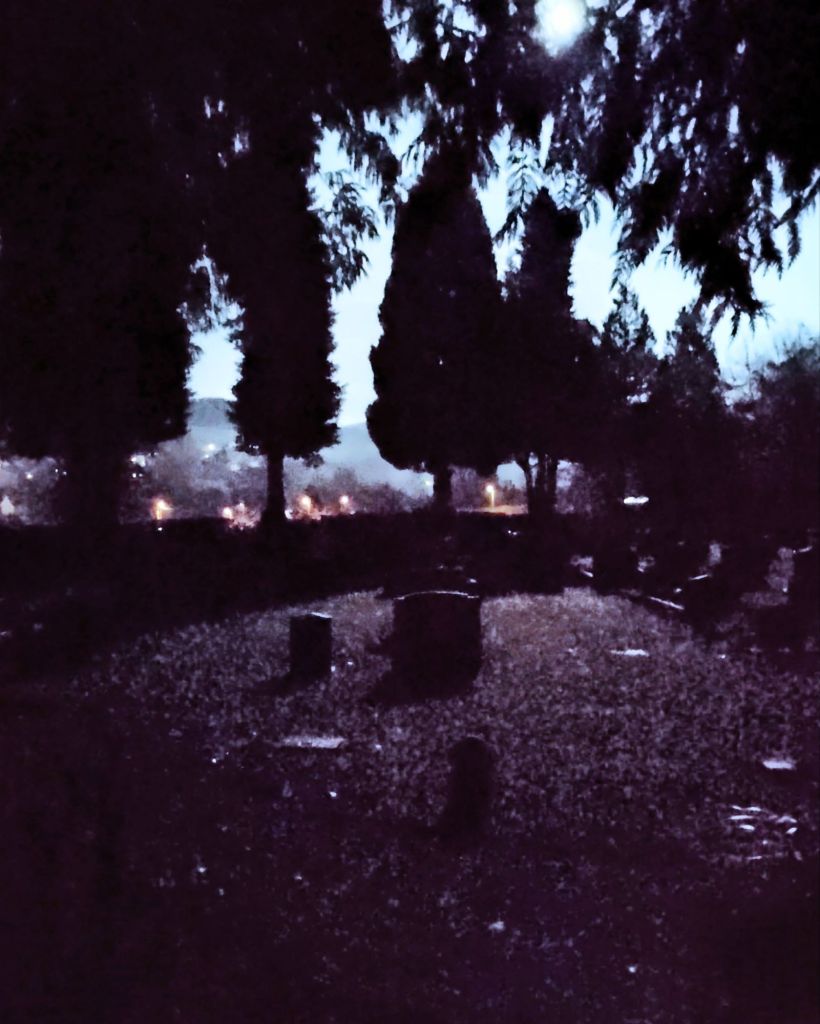 Sentinel yews at night guarding Llangattock cemetery, Powys.