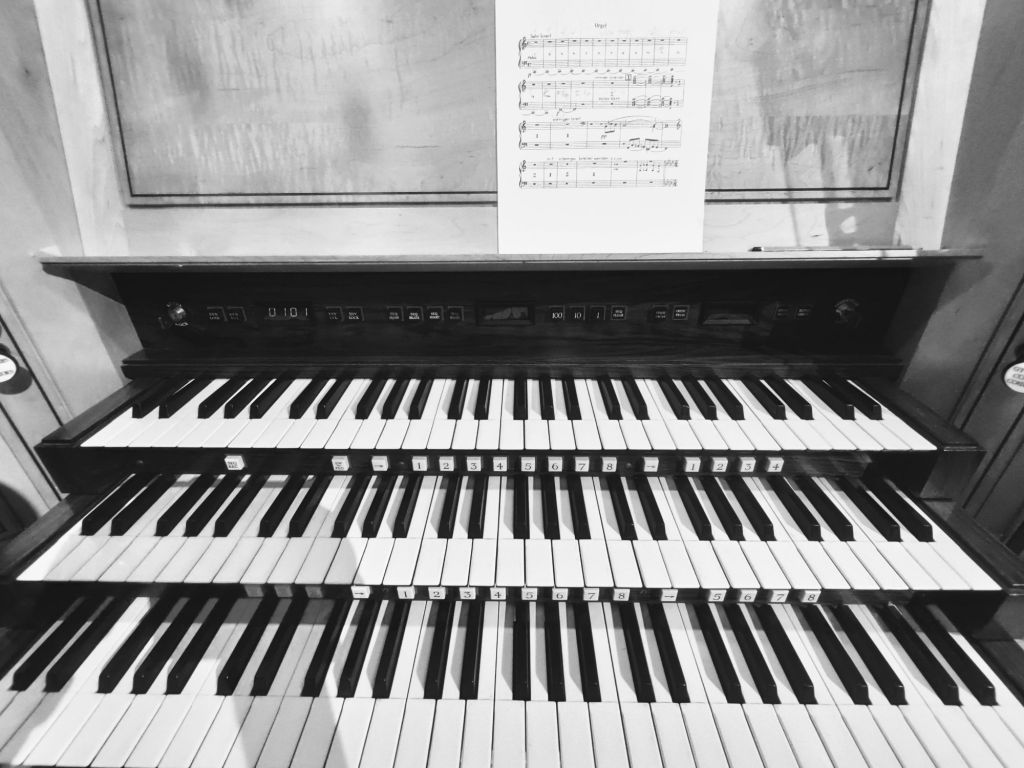 Three manual organ at St David’s Hall, Cardiff, with a score of the opening of Also Sprach Zarathustra by Richard Strauss.
