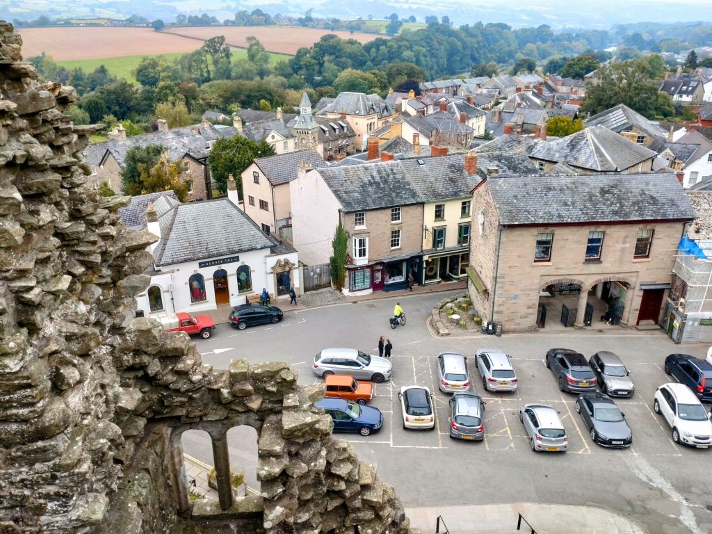 Hay-on-Wye market hall and square, viewed from the ruins of Castell Y Gelli — Hay Castle.